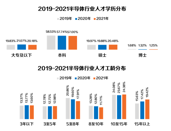 近三年半导体中高端人才性别构成中◈◈ღ,男性占比70%以上ballbet贝博网站官网◈◈ღ,2019-2021女性占比逐渐增加◈◈ღ。本硕学历以上达78.7%◈◈ღ;从年龄看◈◈ღ,25-35岁占比达60%◈◈ღ,25岁以下年轻人才◈◈ღ、35岁以上的资深人才占比逐年提升◈◈ღ;从工龄来看◈◈ღ, 以5至8年及10年以上的人才为主◈◈ღ,占比超6成◈◈ღ,15年以上经验丰富的人才占比逐年上升◈◈ღ。