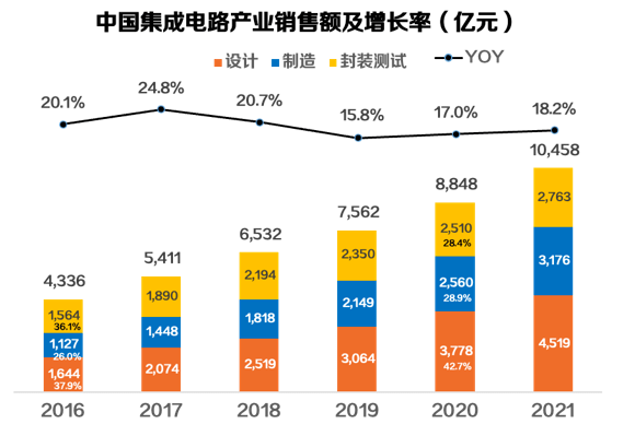 从区域结构来看◈◈ღ,美国在半导体研发设计中领先网络红人扒皮◈◈ღ,亚洲在制造业中领先◈◈ღ;中国在半导体整体价值链中占9%◈◈ღ,消费市场中占24%◈◈ღ;2021年中国集成电路产业销售额为10,458.3亿元◈◈ღ,首次突破万亿元◈◈ღ,同比增长18.2%◈◈ღ;中国集成电路产业结构也逐步从附加值相对较低的封装测试领域向附加价值更高的设计领域转型◈◈ღ,2021年设计业销售额达到4,519 亿元◈◈ღ,同比增长19.6%◈◈ღ;制造业销售额达到3,176.3亿元◈◈ღ,同比增长24.1%◈◈ღ;封装测试业销售额为2,763 亿元◈◈ღ,同比增长10.1%◈◈ღ。