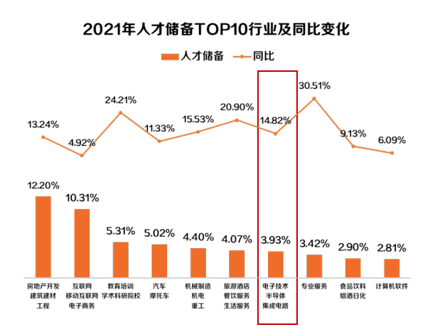 半导体行业需求仅次于汽车摩托车行业◈◈ღ,同比上一年增长54.53%◈◈ღ;人才储备增速为14.82%◈◈ღ,人才增速无法满足需求增长◈◈ღ。