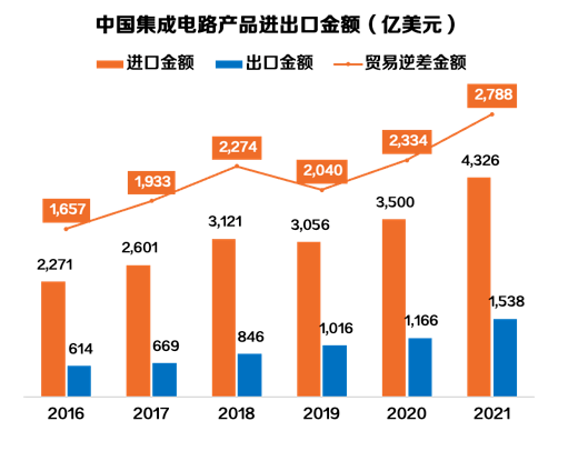 2020我国芯片自给率仅为30%左右◈◈ღ,提升高端芯片国产化率◈◈ღ,实现高端芯片设计制造的国产化替代将是我国芯片产业下一阶段的重要奋斗目标◈◈ღ;2020年在中国销售的1,434亿美元IC中◈◈ღ,在中国生产的IC仅占15.9%ballbet贝博网站官网◈◈ღ,约227亿美元◈◈ღ。其中◈◈ღ,总部位于中国大陆的公司的总产值仅为83亿美元◈◈ღ,非中国大陆拥有晶圆厂业务的公司(例如◈◈ღ,台积电◈◈ღ、SK海力士◈◈ღ,三星等)仍占中国IC产量的大部分◈◈ღ;海关总署数据显示◈◈ღ,2021年中国集成电路进口规模4,325.5亿美元◈◈ღ, 贸易逆差逐年加剧达2,788亿美元◈◈ღ,反映出我国集成电路产品依然需要大量进口网络红人扒皮◈◈ღ。