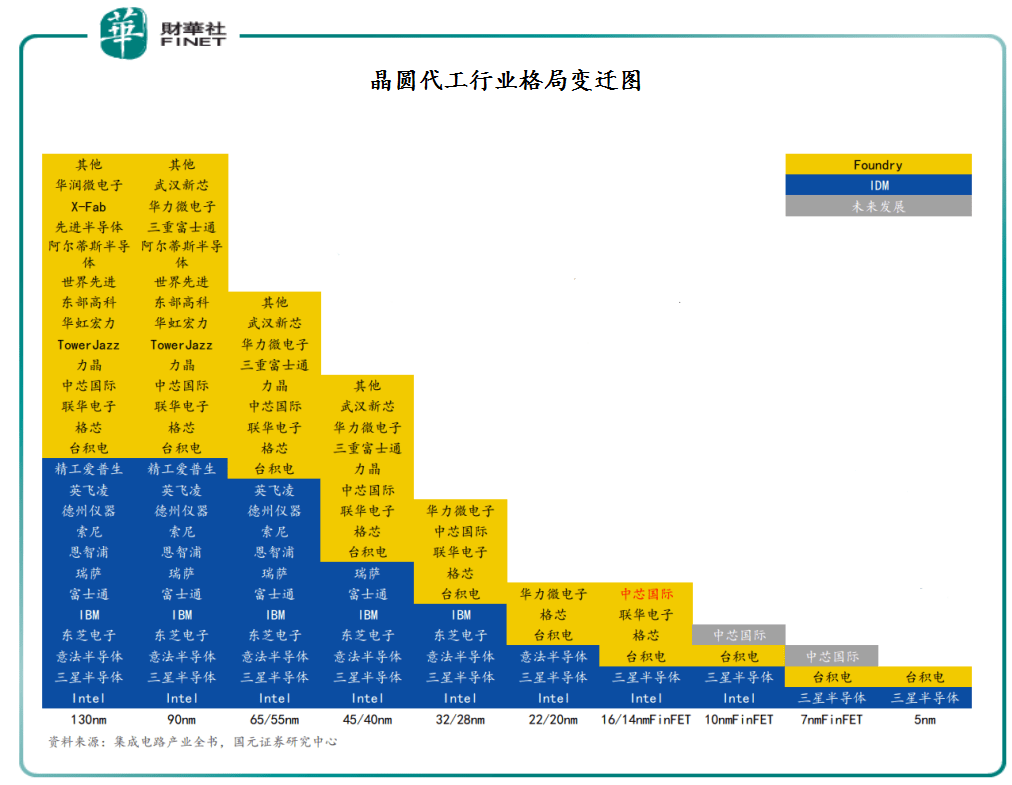 根据国元证券数据统计,从目前晶圆代工行业竞争格局变迁来看,随着工艺节点的推进,受困于工艺技术迭代快、投资资金投入大等因素影响,参与竞技玩家越来越少,28nm到14nm是个明显的分水岭,14nm开始使用3D结构的晶体管,制造难度陡增,行业竞争对手越来越少。